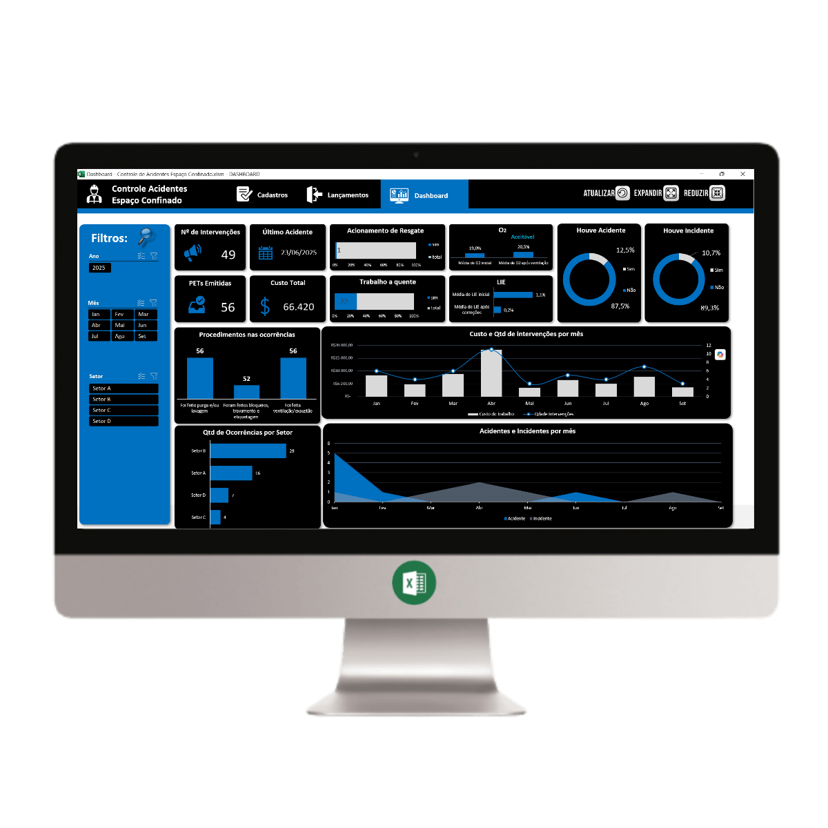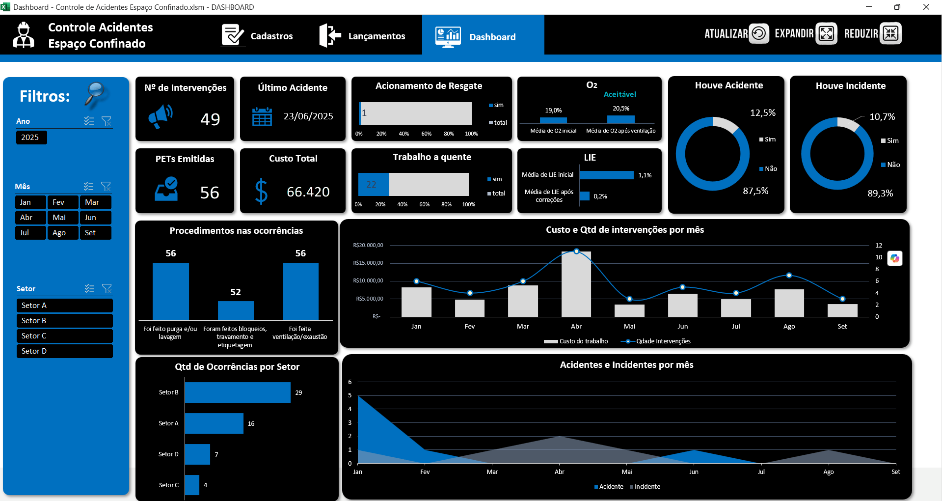 –Acionamento do resgate, 02, houve acidente, houve incidente, trabalho quente, lie, procedimentos nas ocorrências, custo e quantidade dde intervenções por mês, quantidade de ocorrências por setor, acidnetes e incidentes por mês;