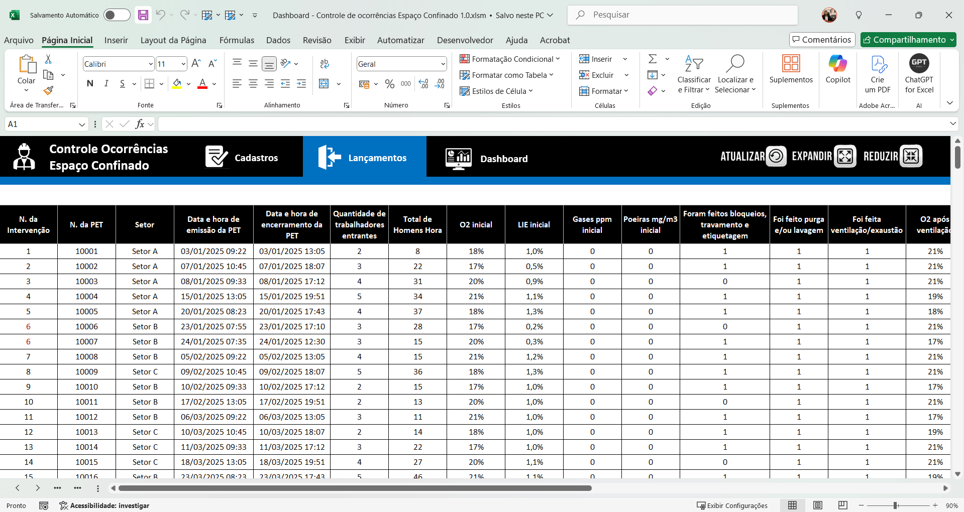 –N. da interenção, n. da PET, setor, data e hora de emissão da pet, data e hora de encerramento da PET, quantidade de trabalhadores entrantes, total de horas, 02 inicial, gases ppm inicial, poeiras mg/m3 inicial, foram feito purga e/ou lavagem, foi feita ventilação/exautão, 02 após ventilação, LIE após correções, gases ppm após ventilação, poeiras mg/m3 após ventilação, custo do trabalho, houve acidente, houve incidente, houve acionamento do resgate, houve trabalho a quente, quantidade intervenções;