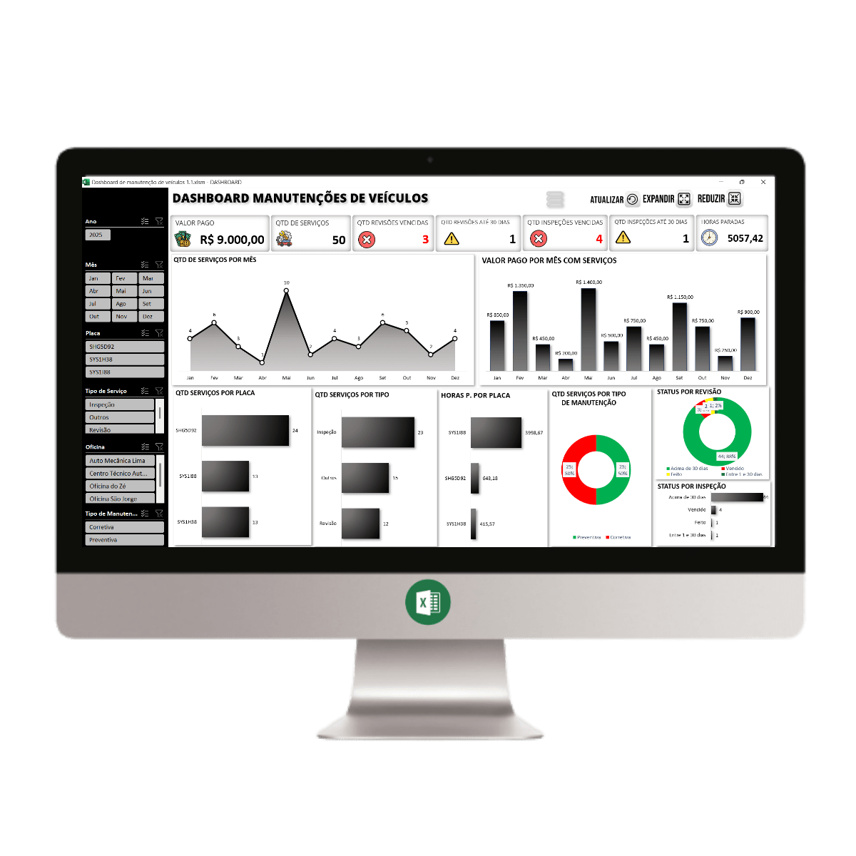 –Quantidade de serviços por mês, valor pago por mês com serviços, quantidade serviçoes por placa, quantidade serviços por tipo, horas p. por placa, quantidade serviços por tipo de manutenção, status por revisão;