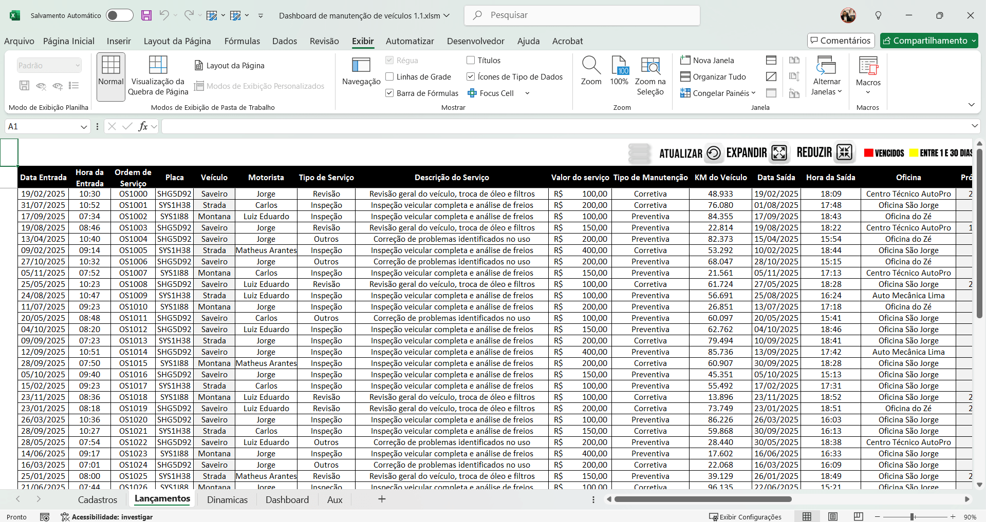 –Data entrada, hora da entrada, ordem de serviço, placa, motorista, tipo de serviço, descrição do serviço, valor do serviço, tipo de manutenção, km do veículo, data saída, hora saída, oficina, revisão feita após vencimento, inspeçõa feita após vencimento;
