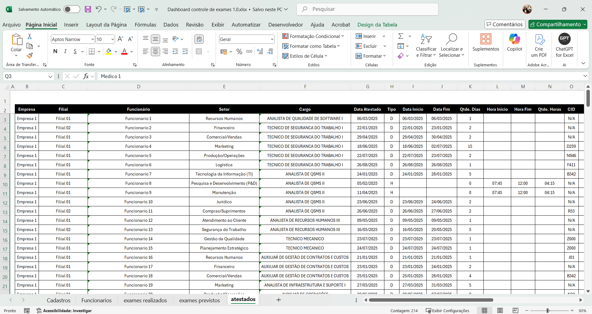 –Empresas, filial, funcionário, procedimento, setor, cargo, data atestado, tipo, data início, data fim, quantidade de dias, hora início, hora fim, quantidade horas, cid, motivo, médico, inclusão;