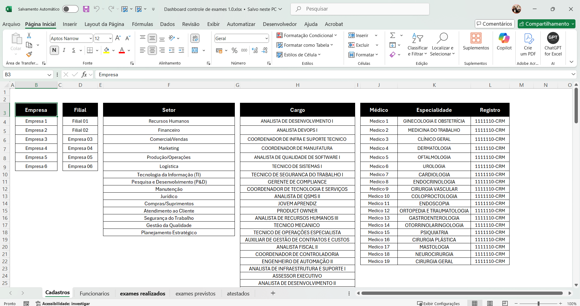 –Empresa, filial, setor, cargo, médico, especialidade, registro;