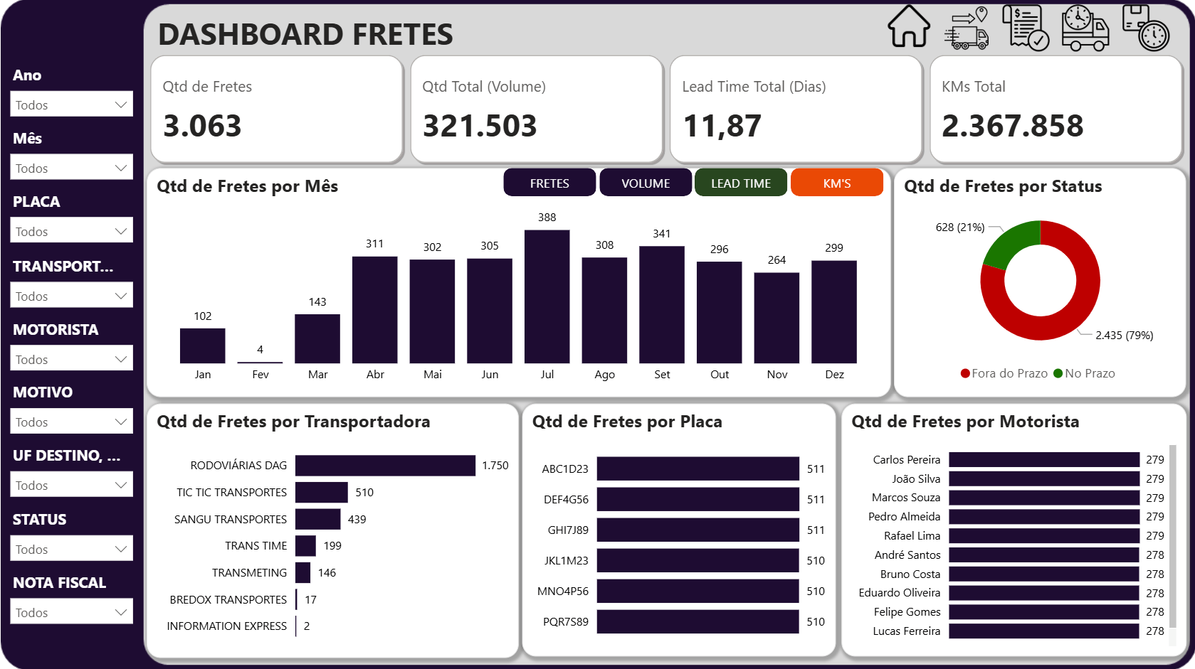 –Kms por mês, quantidade de fretes por status, quantidade de fretes por tranportadora, quantidade de fretes por placa, quantidade de fretes por motorista;