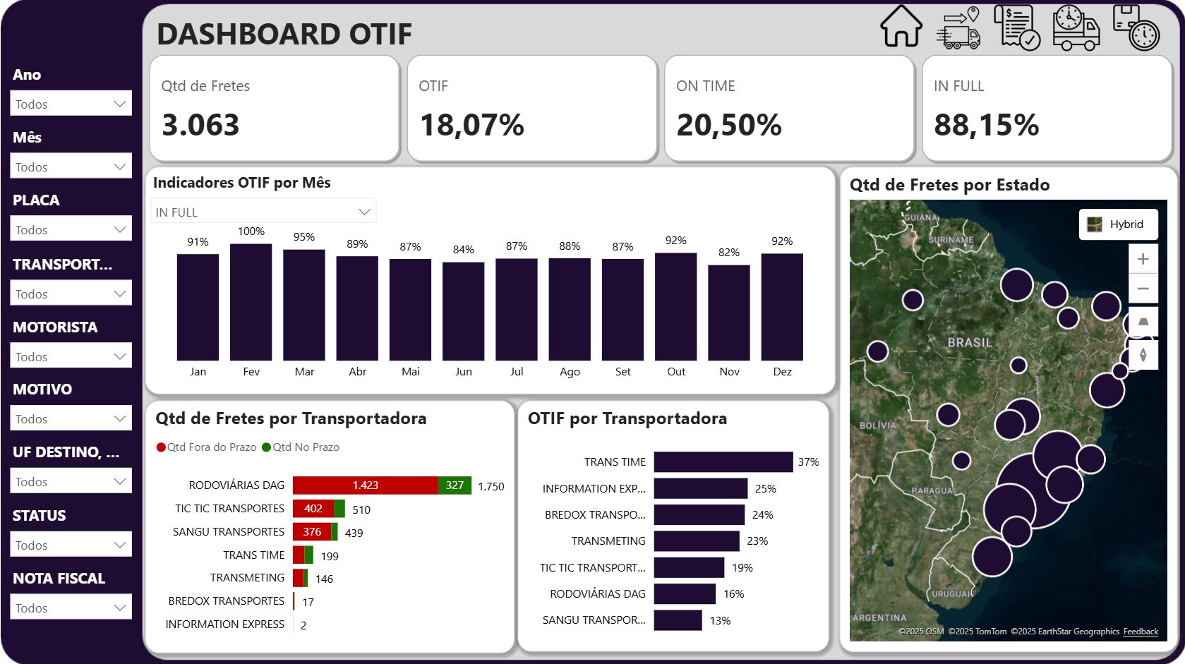 –Inidicadores otif por mês, quantidade de fretes por tranportadora, otif por tranportadora, quantidade de fretes por estado;