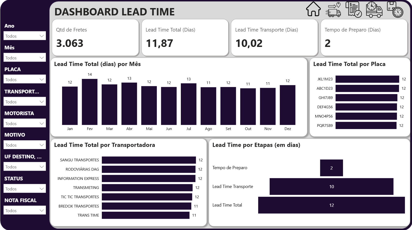 –Lead time total (dias) por mês, lead time total por placa, lead time total por tranportadora, lead time por etapas(em dias);