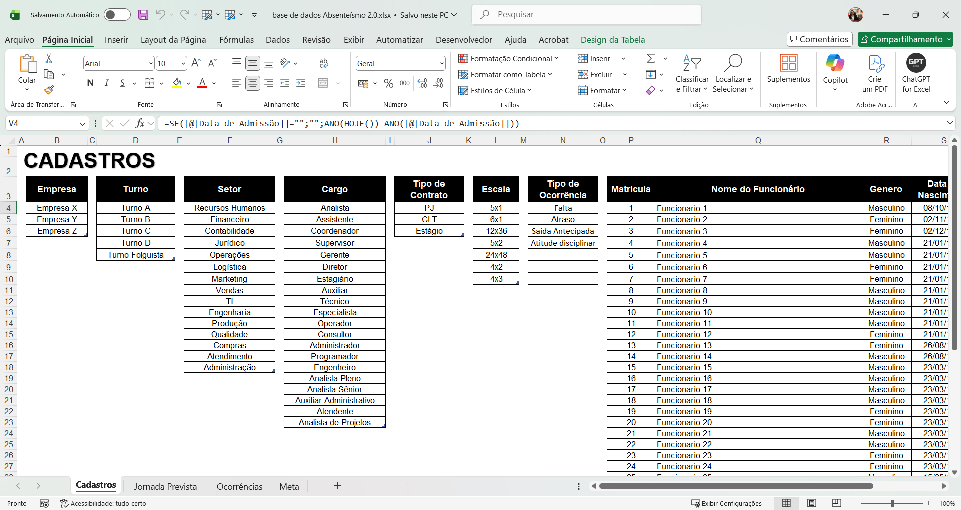 –Empresa, turno, setot, cargo, tipo de contrato, escala, tipo de ocorrência, matricula, nome do funcionário, gênero, data de nascimento, data de admissão, foto;