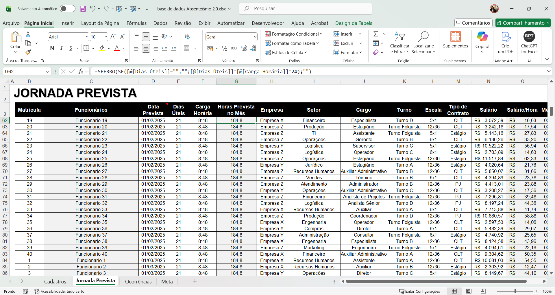 –Matricula, data prevista, dias úteis, carga horária, empresa, setor, cargo, turno, escala, tipo de contrato, salário;