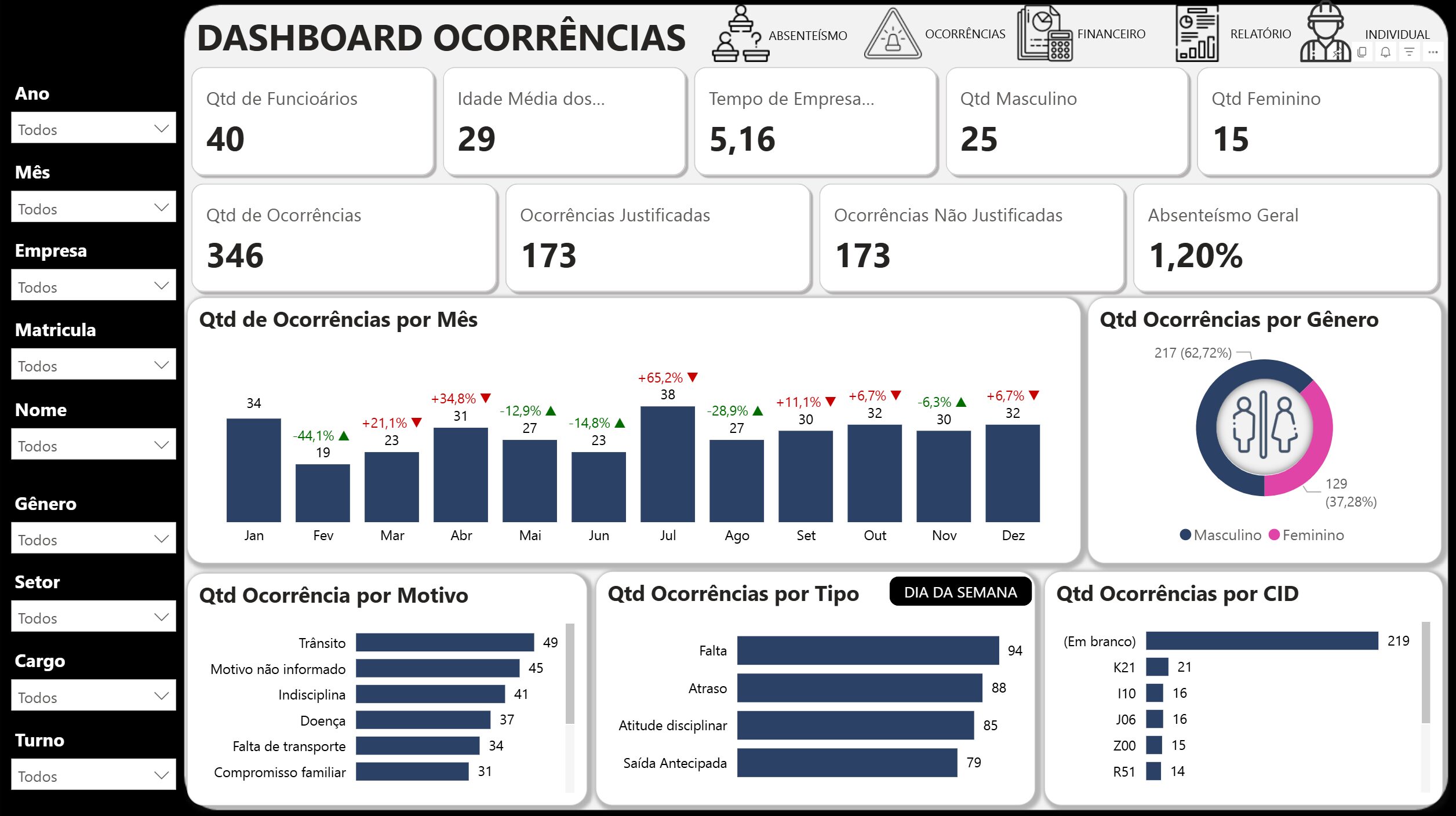 –Absenteísmo x meta geral por mês, absenteísmo por gênero, absenteísmo por ocorrência, absenteísmo por turno, absenteísmo por setor;