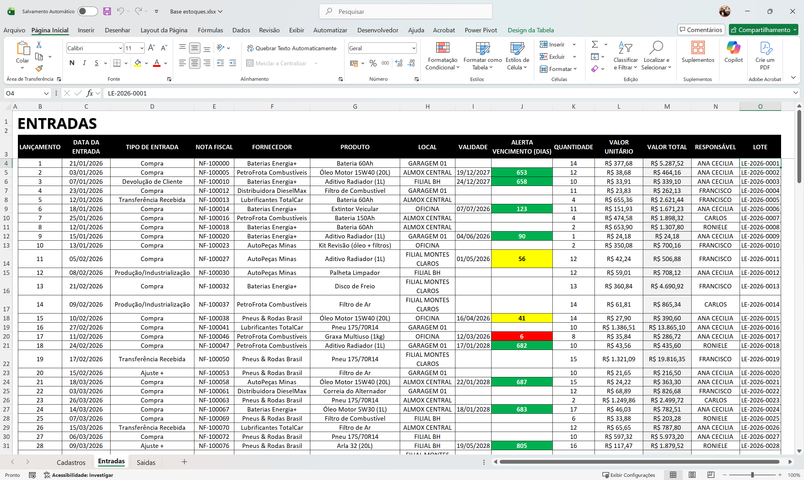 –Lançamento, data da entrada, tipo de entrada, nota fiscal, fornecedor, produto, local, validade, alerta vencimento(dias), quantidade, valor unitário, responsável, lote;