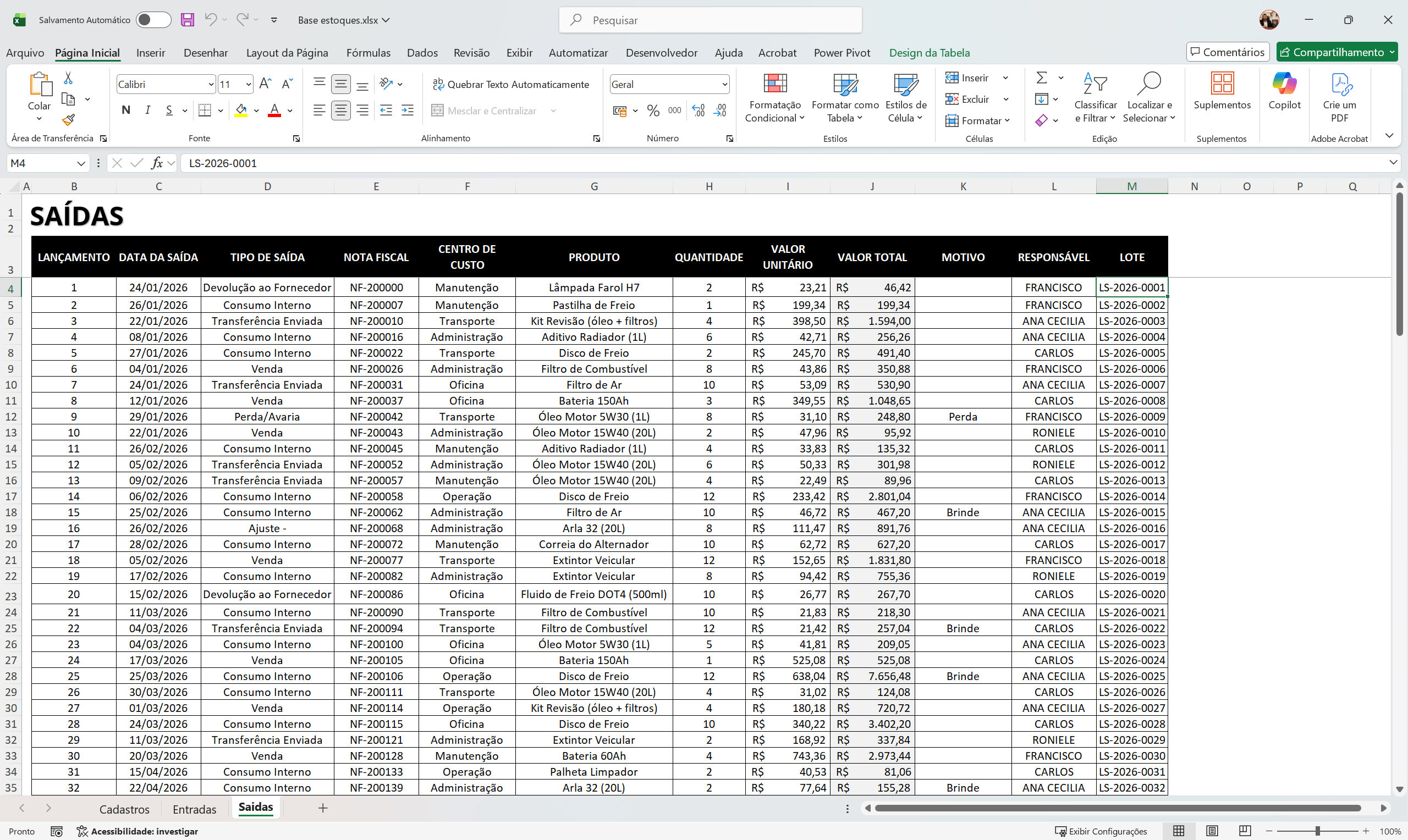 –Lançamento, data da saída, tipo de saída, nota fiscal, centro de custo, produto, quantidade, valor unitário, motivo, responsável, lote;