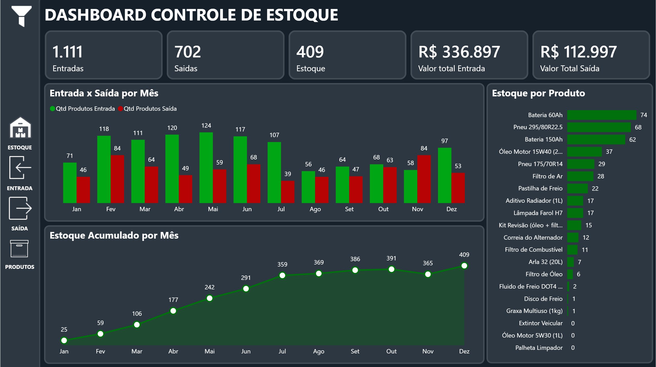 –Entrada x saída por mês, estoque por produto, estoque acumulado por mês;
