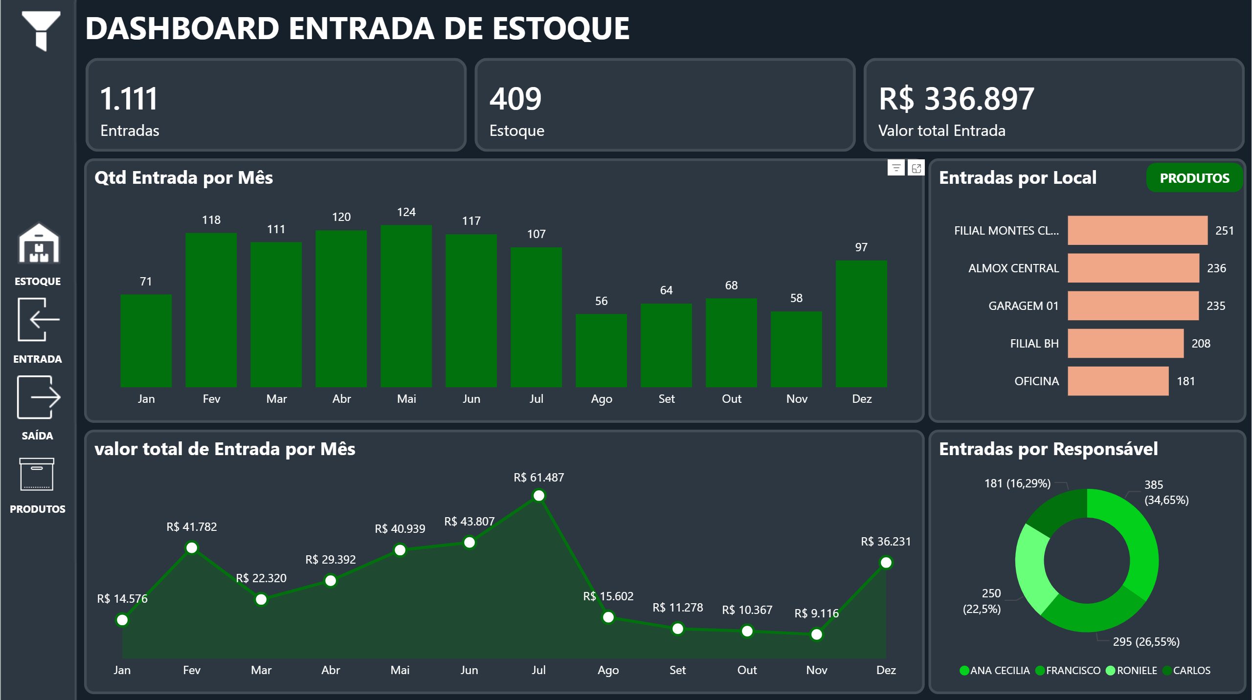 –Quantidade entrada por mês, entradas por produto, valor total de entradas por mês, entradas por responsável;