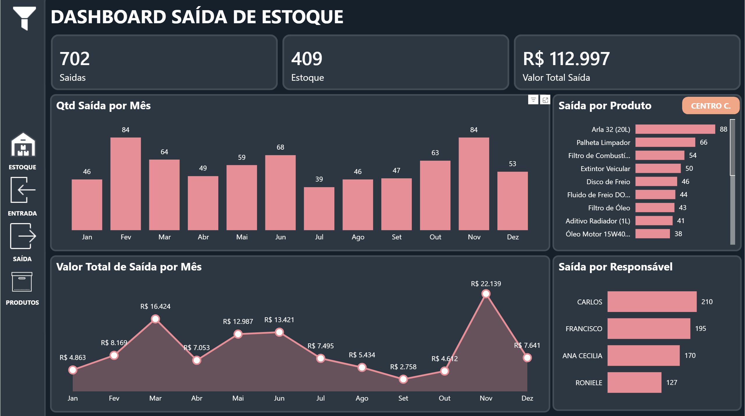 –Quantidade saída por mês, saída por produto, valor total de saída por mês, saída por responsável;