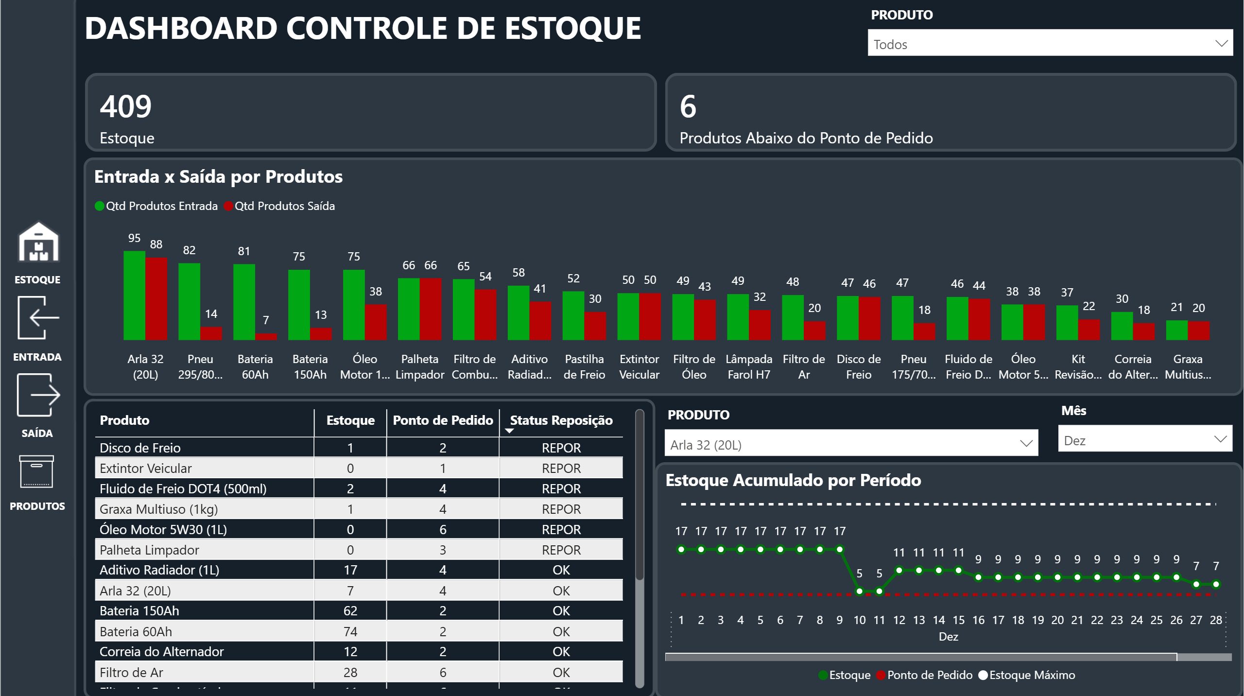 –Entrada x Saída por produto, estoque acumulado por período;