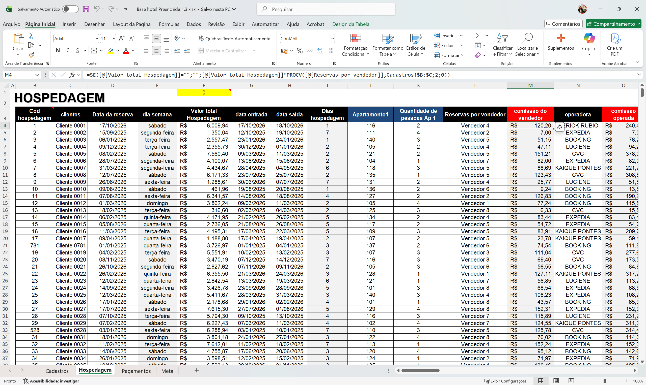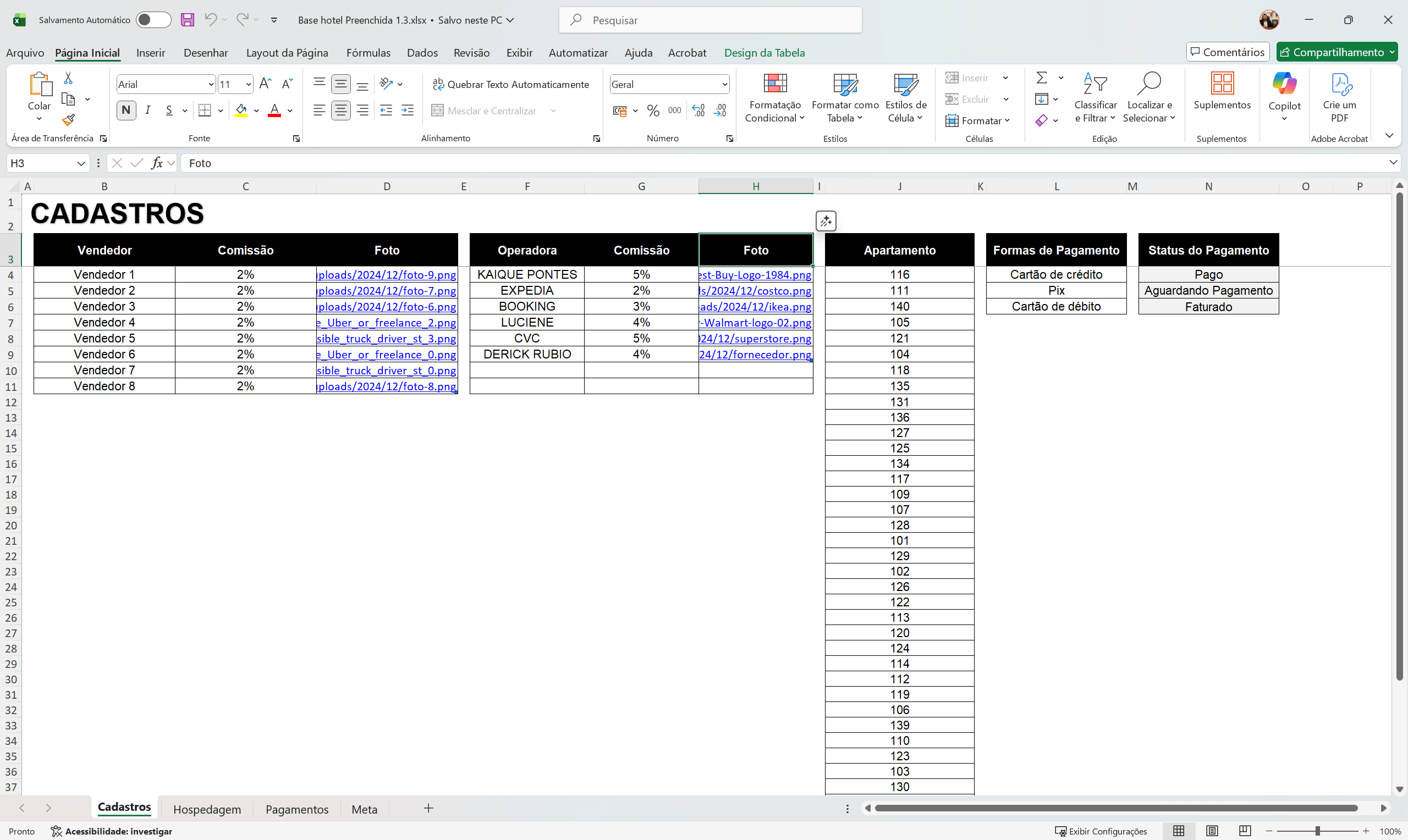 –Cód. hospedagem, clientes, data da reserva, valor total hospedagem, data entrada, data saída, apartamento1, quantidade de pessoas ap1, reservas por vendedor, operadora, imposto, taxa de cartão, café, outros, descrição outros, apartamento2, quantidade de pessoas ap2, ap3, ap4…, fotos;