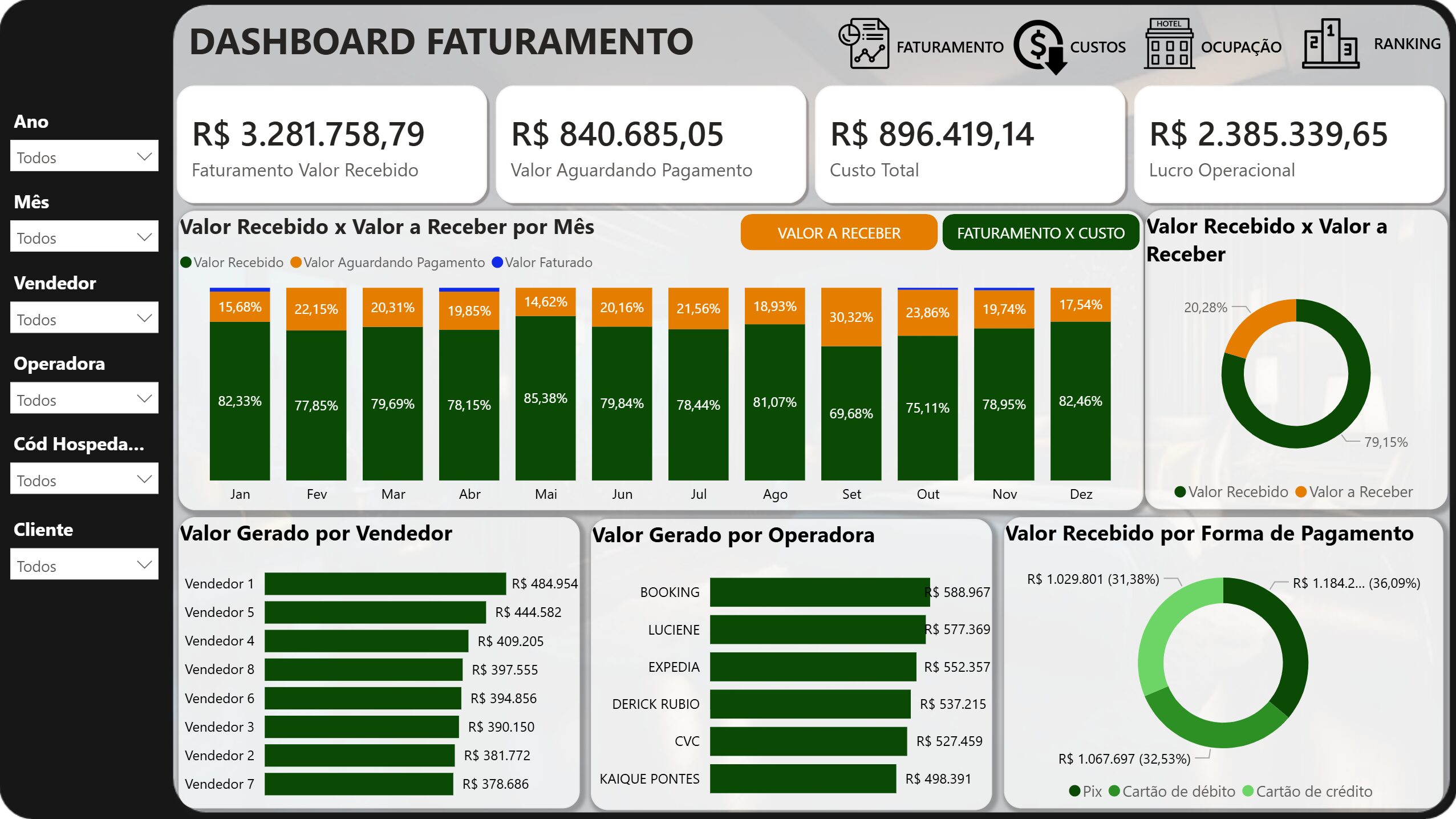 –Faturamento valor recebido, valor aguardando pagamento, custo total, lucro operacional;
