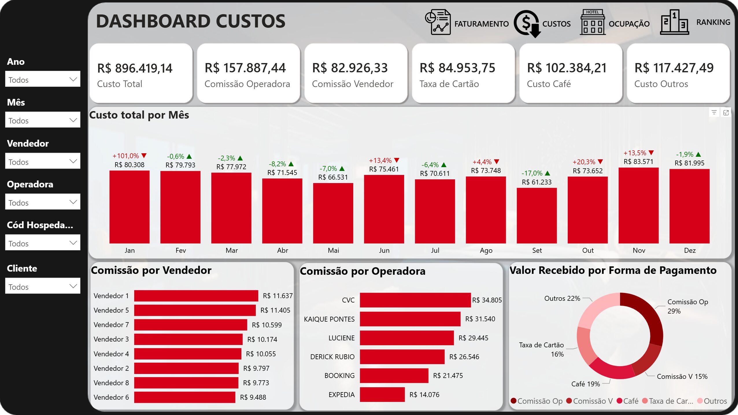 –Custo total por mês, comissão por vendedor, comissão por operadora, valor recebido por forma de pagamento;