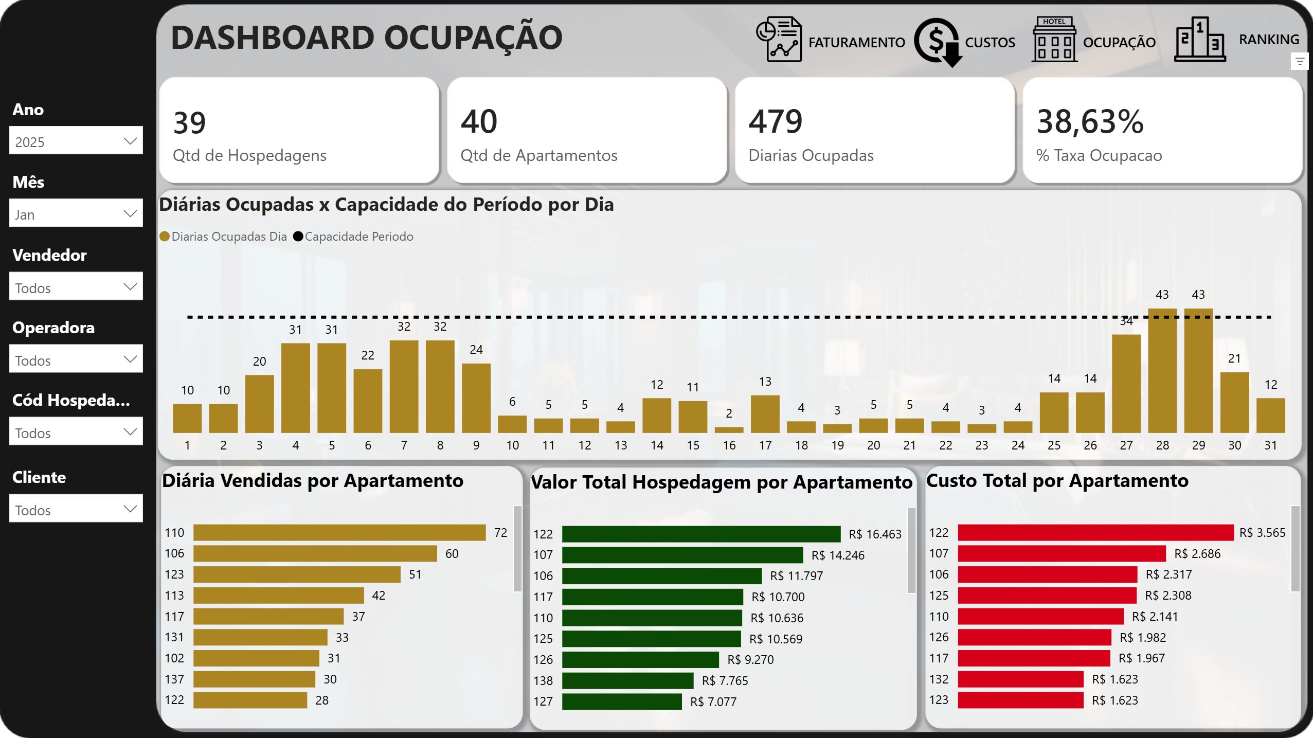 –Diárias ocupadas x capacidade de período por dia, diárias vendidas por apartamento, valor total hospedagem por apartamento, custo total por apartamento;