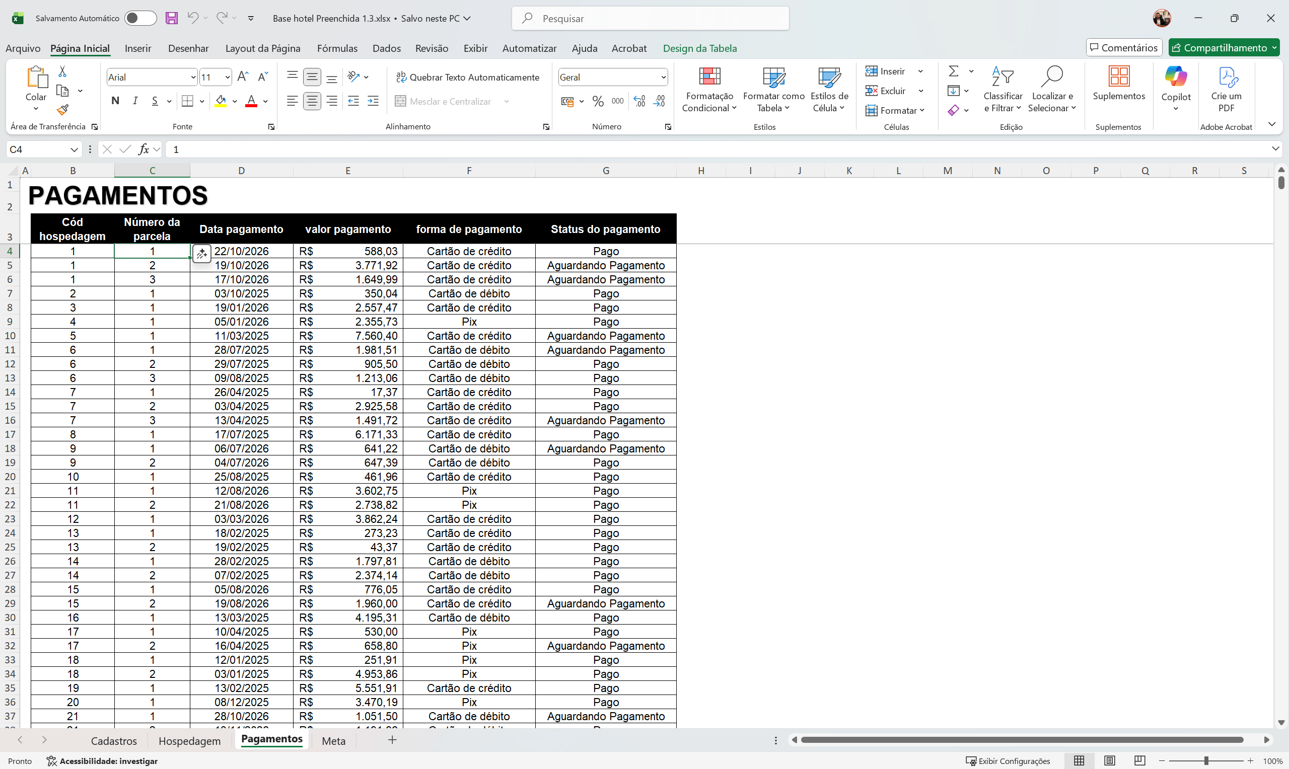 –Cód. hospedagem, número da parcela, data pagamento, valor pagamento, forma de pagamento, status do pagamento;