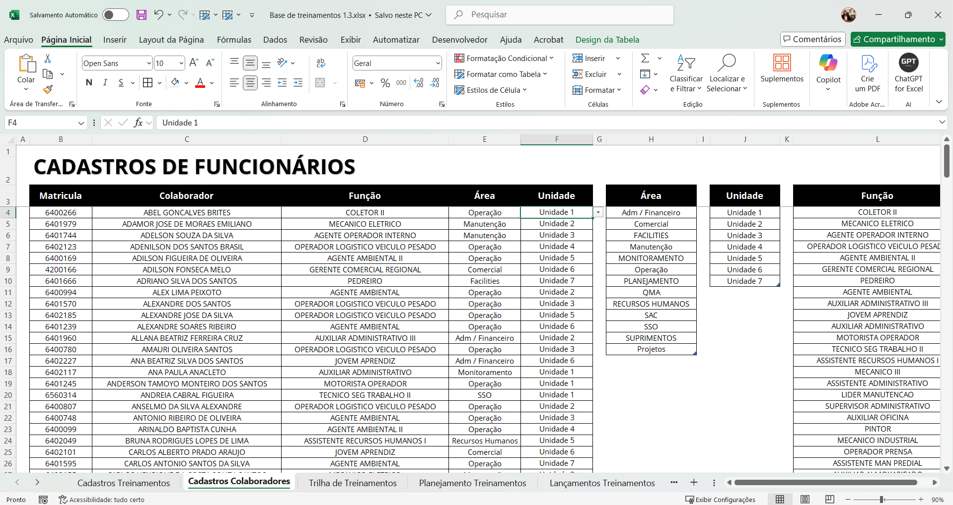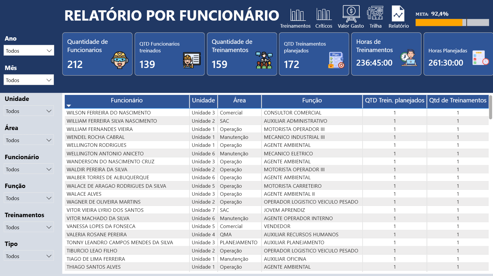 –Funcionário, unidade, área, função, quantidade treinamento planejado, quantidade treinamentos;