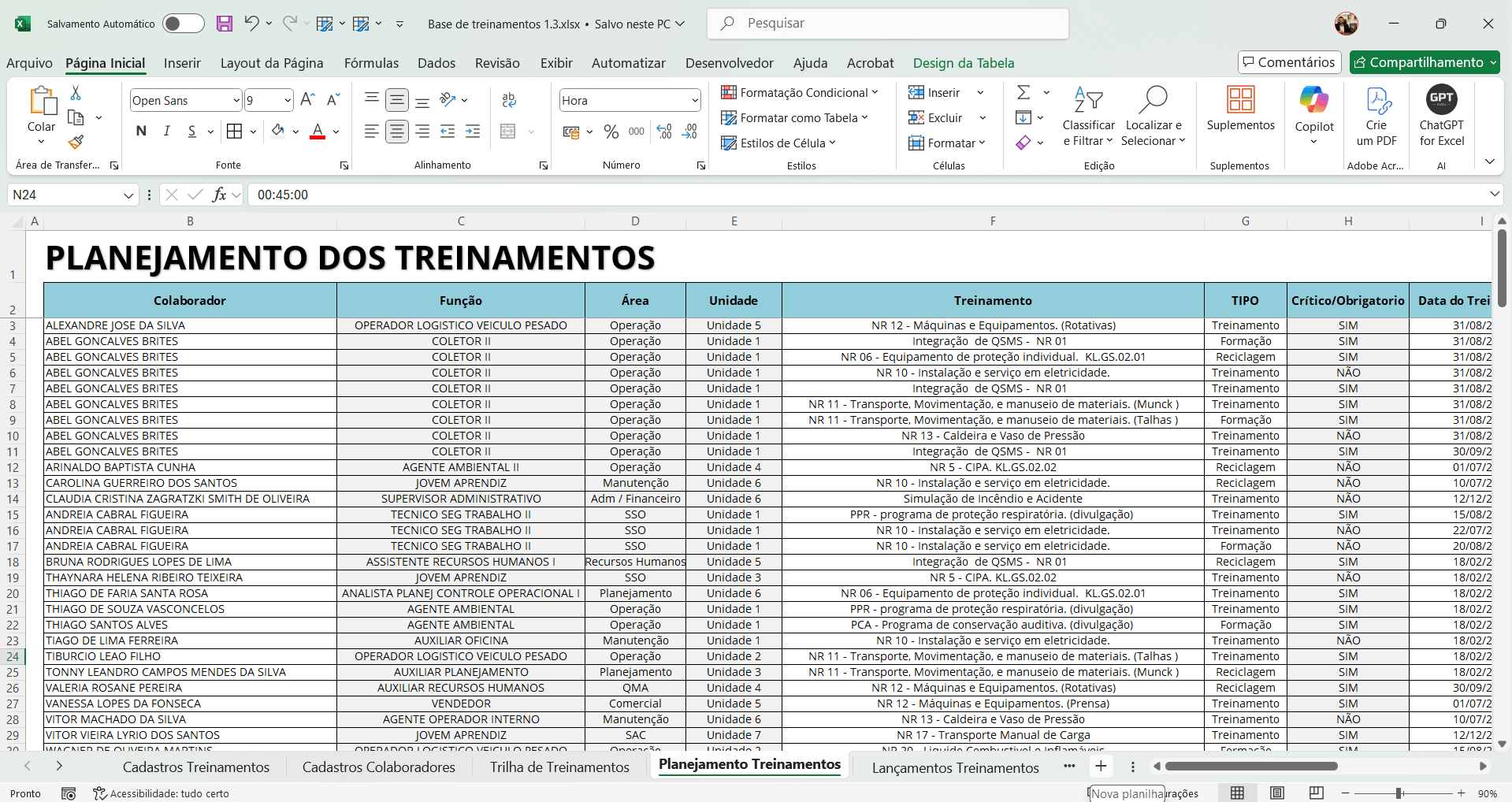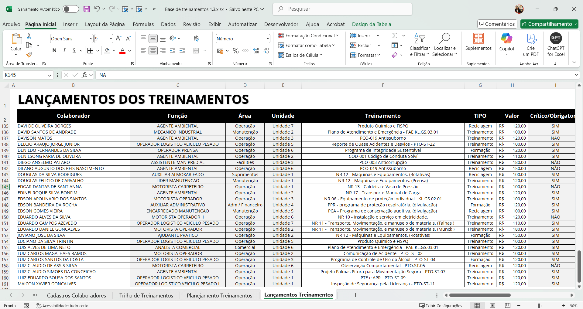 –Função, área, unidade, cirítico/obrigatorio, data da próxima reciclagem, dias restantes, classificação, cont;