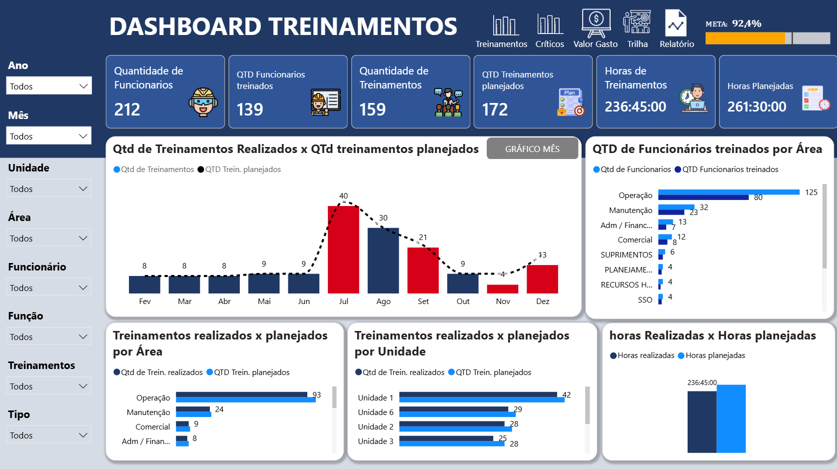 –Treinamentos comparativo ano anteriorx ano atual, quantidade de funcionários treinados por área, treinamnetos realizados x planejados por área, treinamnetos realizados x planejados por unidade, horas realizadas x horas planejadas;