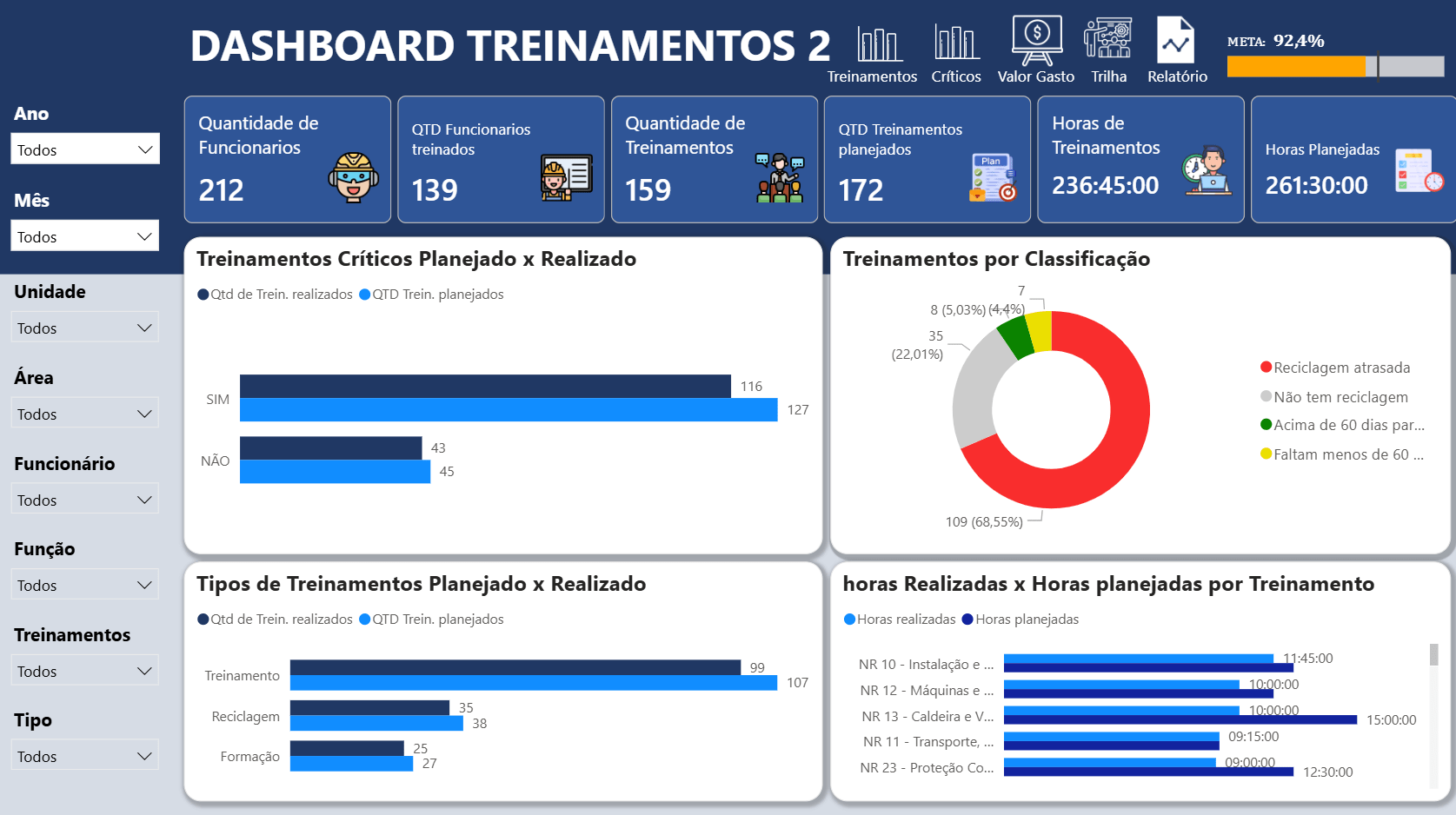 –Treinamentos críticos planejado x realizado, treinamentos por classificação, tipos de treinamentos planejado x realizado, horas realizadas x horas planejadas por treinamentos;